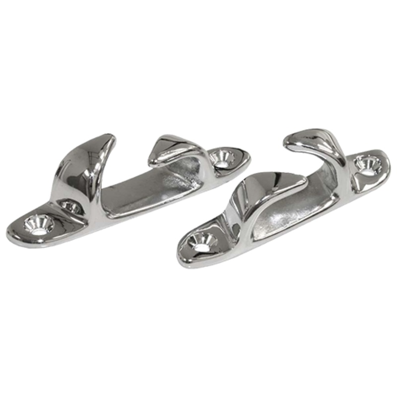 Pair of chrome plated zamak bow chocks (3 3/8"), starboard and port! Screw holes measure 2 1/2" apart on center 5/8" chock opening for easy line positioning